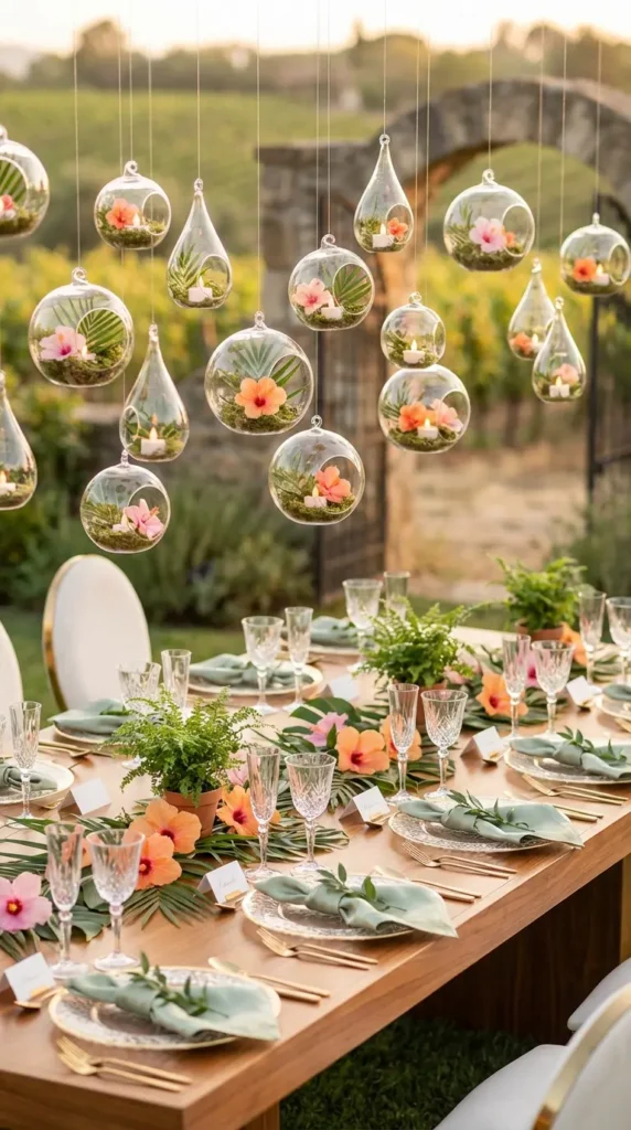 Hanging glass terrariums suspended above or around reception tables bring a genuinely enchanted quality to the room. Each small glass orb or teardrop terrarium filled with moss, tiny flowers, and soft greenery looks like a little world of its own.